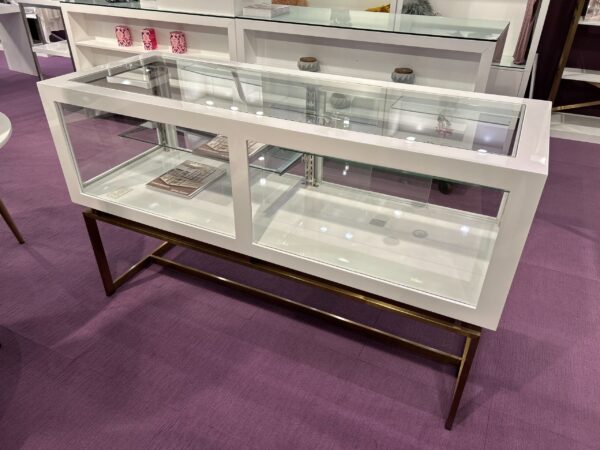 Display Case with keyed lock and sliding glass doors. Available in a high gloss white finish with A brass finish or stainless finish base.
